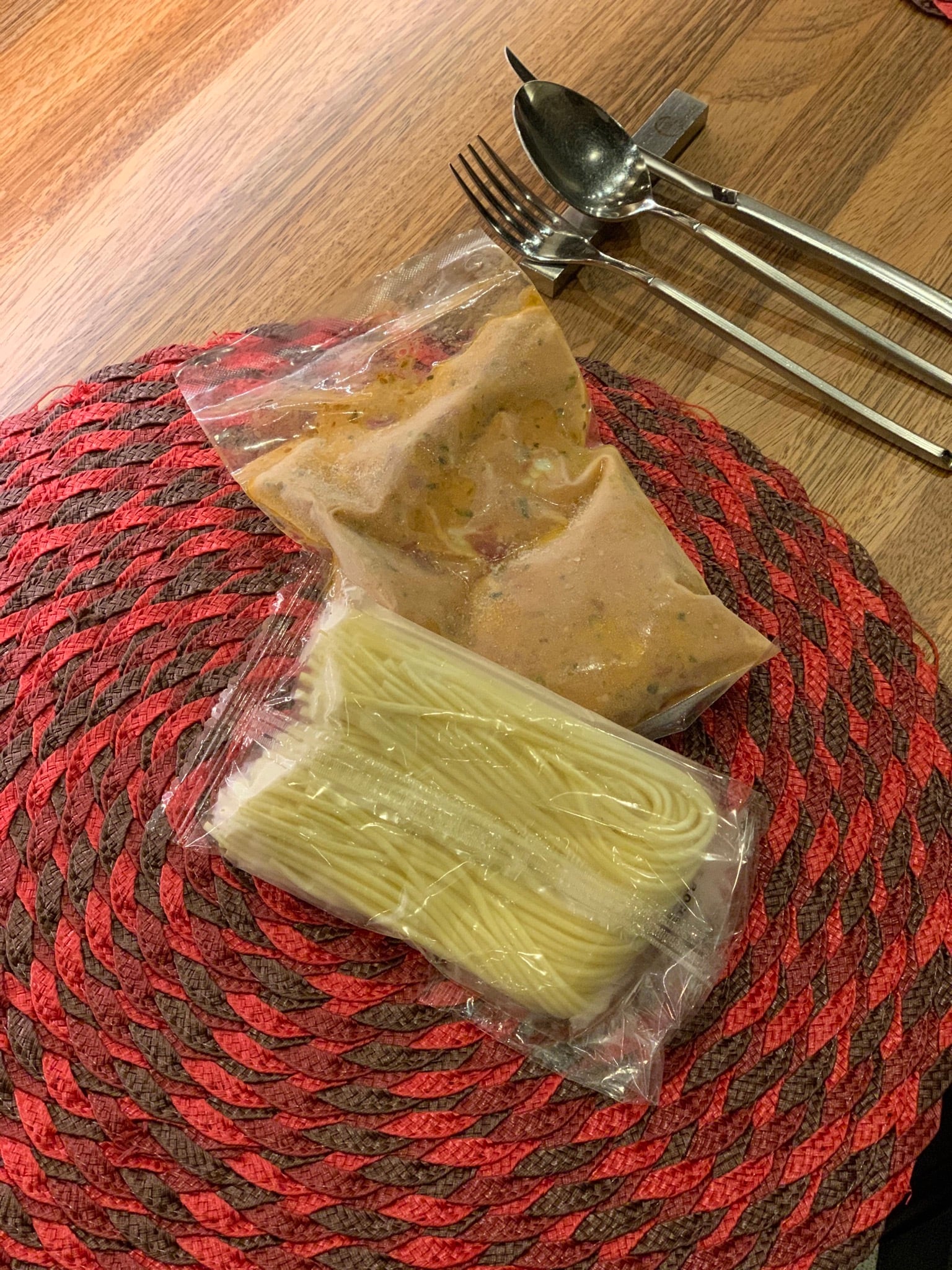 ②ソースはパックのまま解凍するか、冷凍のまま湯せんで5分加熱。